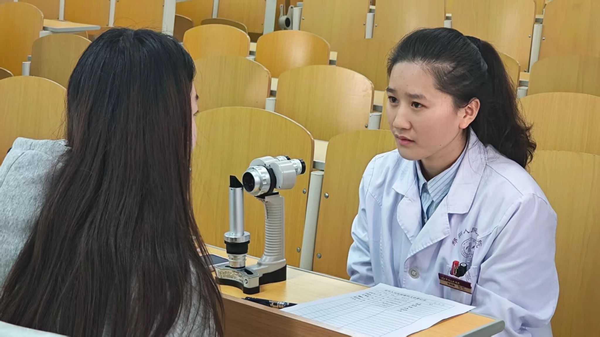 讲解结束后, 医护人员为在场学生开展裂隙灯检查,认真检查每一位学生的眼部状况,精准排查潜在问题。对于检查中发现有异常情况的学生,医护人员详细记录相关信息,并为他们建立初步视力健康档案。同时,根据检查结果,为有需要的学生提供个性化的诊疗建议,指导他们及时就医或调整用眼习惯。