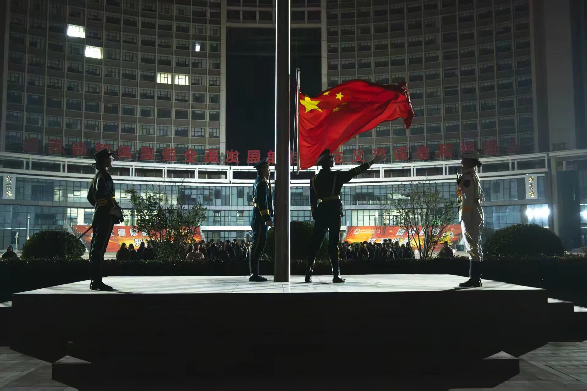 早上6点30分,升旗仪式正式开始。国旗护卫队队员身着整齐划一的制服,迈着坚定有力、整齐划一的步伐,昂首挺胸地护送五星红旗入场。当雄壮激昂的《义勇军进行曲》奏响,鲜艳的五星红旗在晨风中冉冉升起、迎风飘扬。全体师生神情肃穆,肃立行注目礼,目光紧紧追随国旗,心中满是对祖国的无限热爱与崇高敬意。