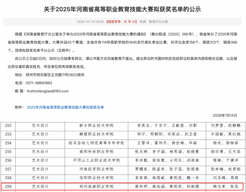 2026年1月15日,河南省教育厅公布了2025年河南省职业院校技能大赛获奖结果。我院视觉传达设计专业参赛团队在辅导教师韩志孝、张侃的带领下,凭借扎实的专业功底、出色的创意表达与稳定的现场发挥在艺术设计赛项中荣获银奖,充分展现了我院设计类专业的教学水平与人才培养成效。