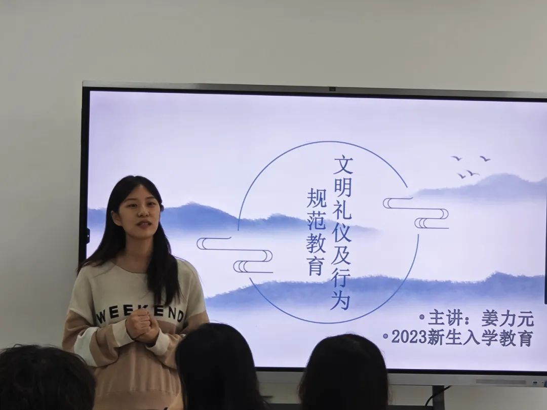 文明礼仪是大学生必备的基本素质,也是构建和谐校园的重要保障。为了让新生对文明礼仪有更深刻的理解和更深层次地领悟,2023年10月18日,我院开展新生入学教育之文明礼仪,由辅导员姜力元主讲。