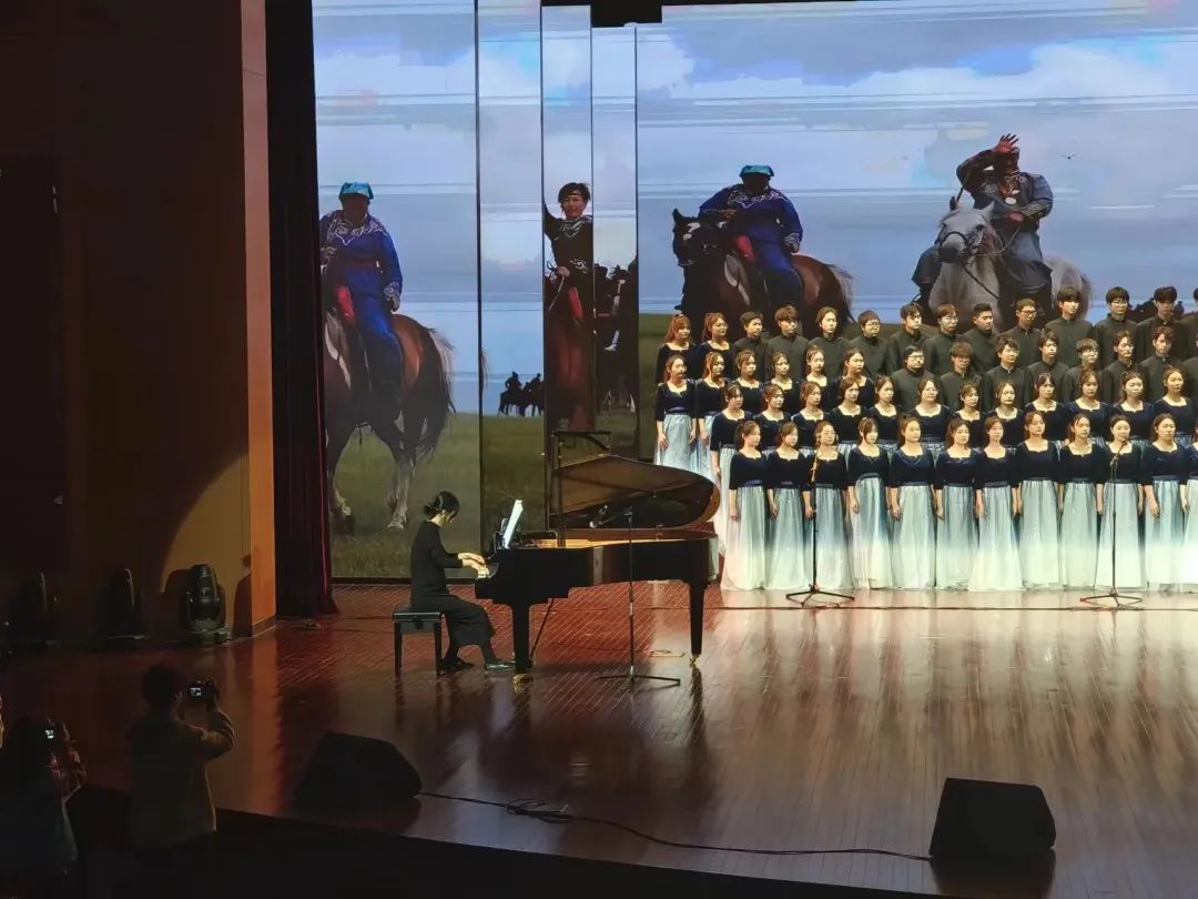 演出现场气氛热烈,激动人心。文化艺术学院合唱团倾情演绎了《不忘初心》和《欢乐的那达慕》两首歌曲。歌声里饱含着对伟大祖国的热爱之情,更寄托着青年学子承继先辈志向,奋进新征程的激情,触动了在场师生的心弦,赢得了阵阵掌声和欢呼声。整个活动高潮迭起,让师生们深切感受到爱国主义情感和民族自豪感。