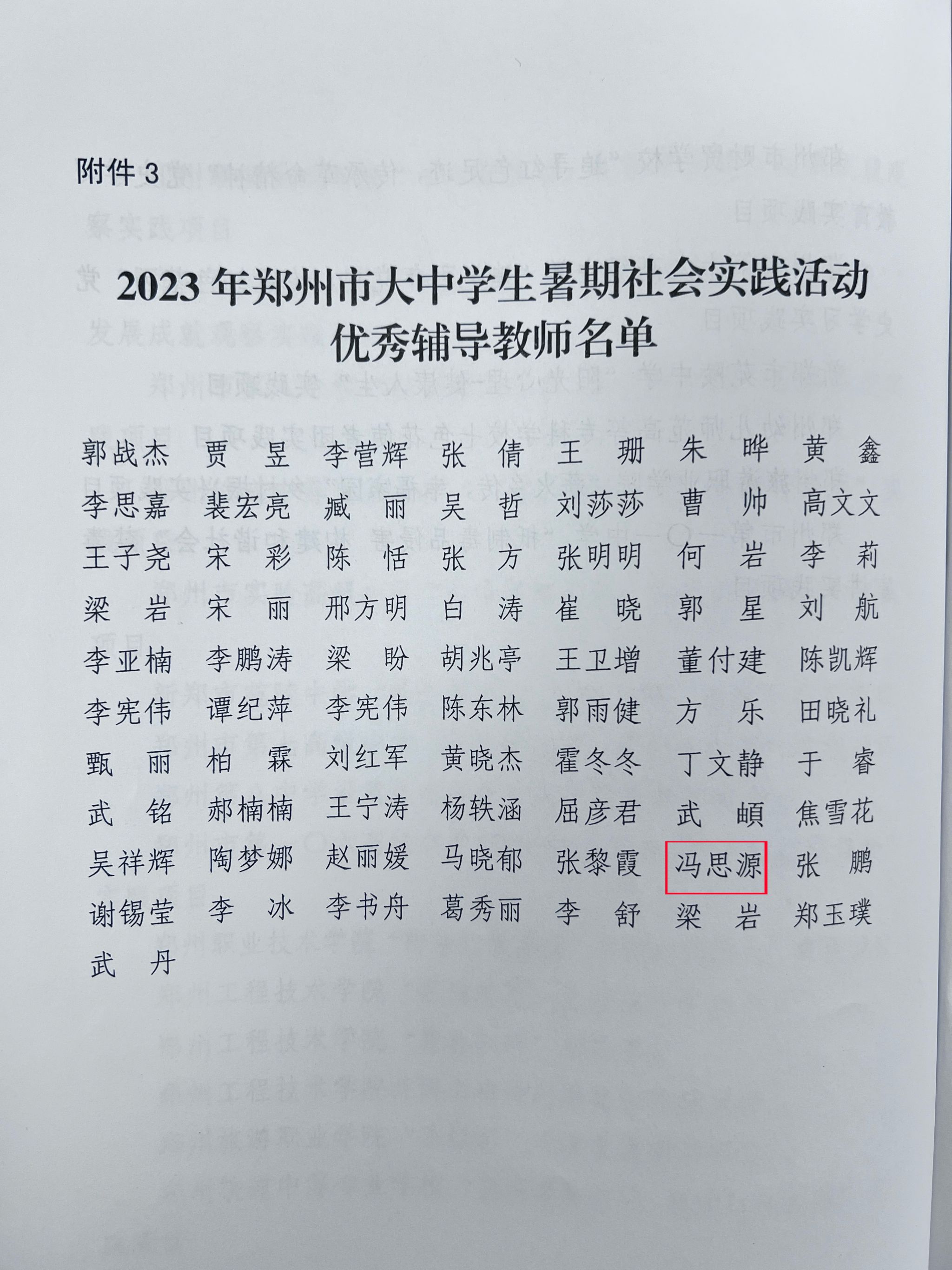近日,经中共郑州市委宣传部、郑州市文明办、共青团郑州市委和郑州市教育局研究决定,我院“豫见文艺”实践项目被评为“郑州市大中学生暑期社会实践活动优秀项目”,冯思源被评为“郑州市大中学生暑期社会实践活动优秀辅导教师”,15名学生被评为“郑州市大中学生暑期社会实践活动先进个人”。