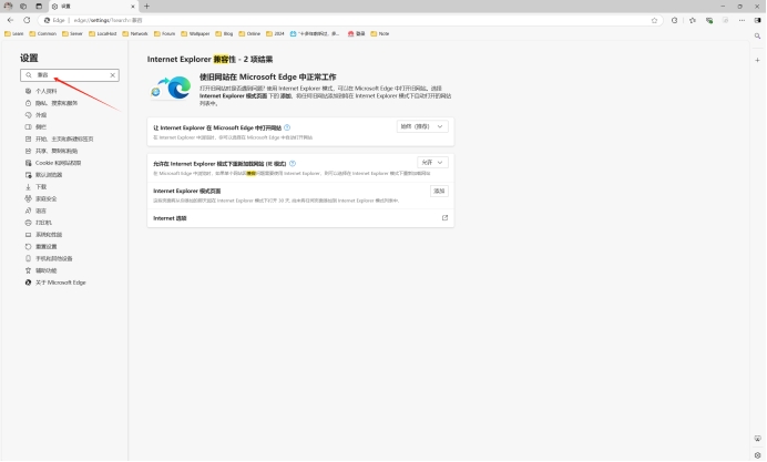 第二步:在左侧栏搜索 “兼容”,找到Internet Explorer 模式页面栏,添加常规模式下不能打开的链接。