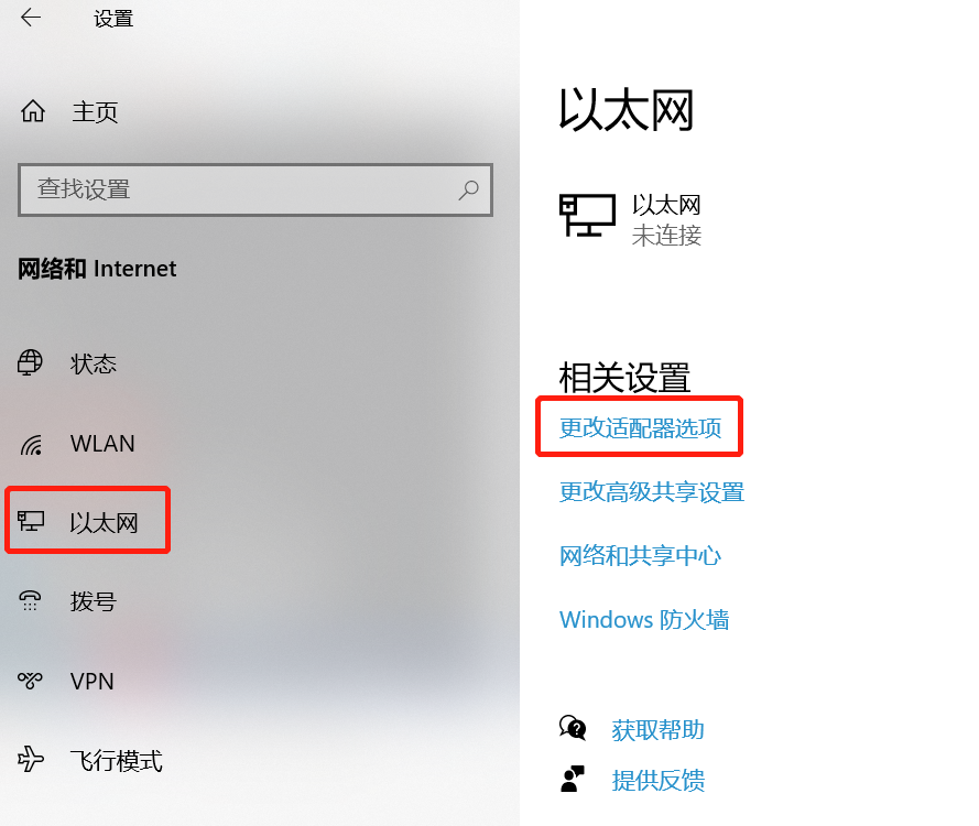 3、弹出页面后选择“以太网”——“更改适配器选项”