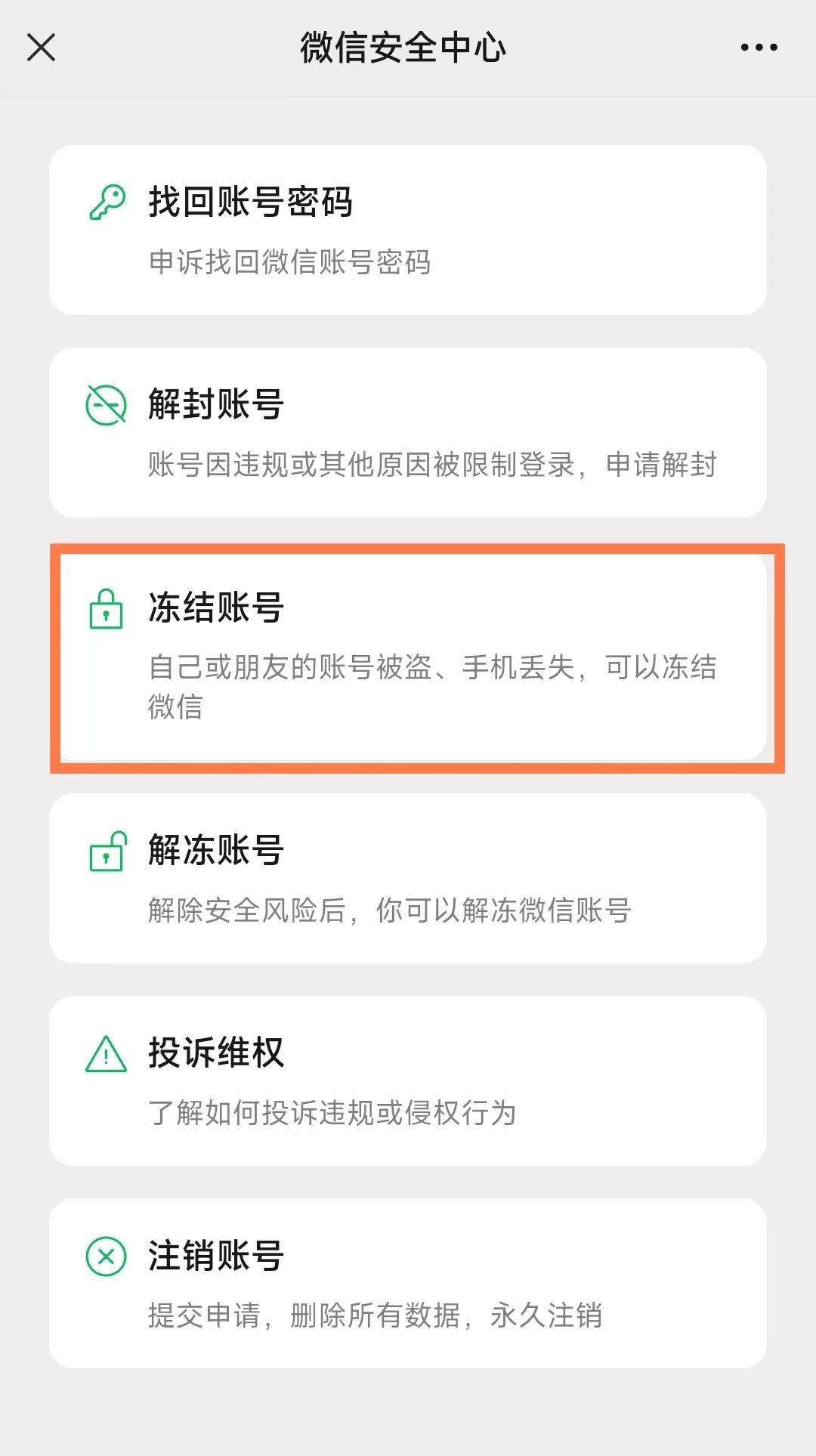 微信冻结:通过其他渠道登录微信-【我】-【设置】-【账户与安全】-【微信安全中心】-【冻结账户】。同时,拨打微信支付客服专线“95017”转9键自助冻结账户支付能力,可有效避免资金损失。