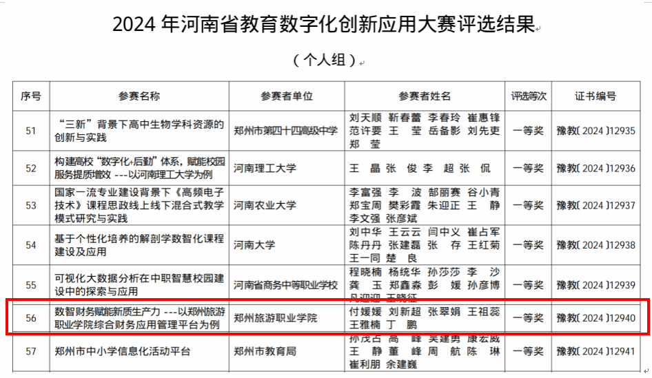 本次比赛全省共有650个项目参与,展现了近年来我省教育信息化领域的创新应用成果以及在推动教育数字转型上的有益探索。海洋之神590登录入口积极参与,其中《数智财务赋能新质生产力——以海洋之神590登录入口综合财务应用管理平台为例》荣获个人组一等奖。