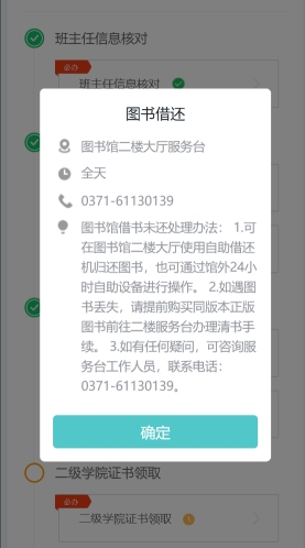 (2)图书借还:如该环节显示黄色图标,则表示该生有欠书未还,需完成还书方可办理离校。