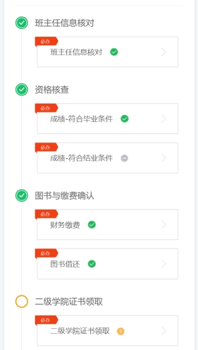 1.离校工作流程分为“班主任信息核对”--->”资格审查”--->“图书与缴费确认”--->”二级学院证书领取”--->“班级证书领取”--->“学生证书领取”六个环节。