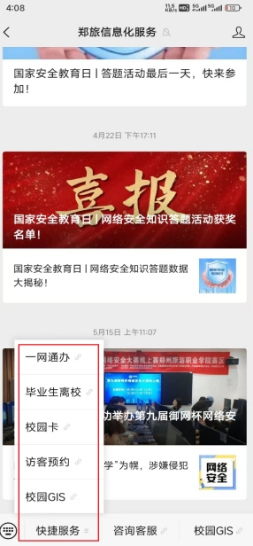 方式二:关注【郑旅信息化服务】公众号,进入公众号,通过左下角的“快捷服务”进入毕业生离校系统。