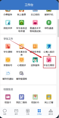 方式一:企业微信-->工作台-->学生工作-->毕业生离校。