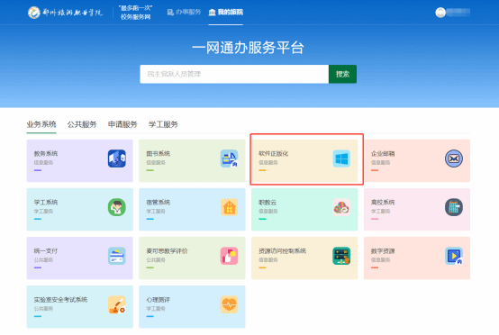 1.登录一网通办(http://i.zztrc.edu.cn/),从【业务系统】组中找到【软件正版化】服务入口,点击进入正版化软件管理服务平台。