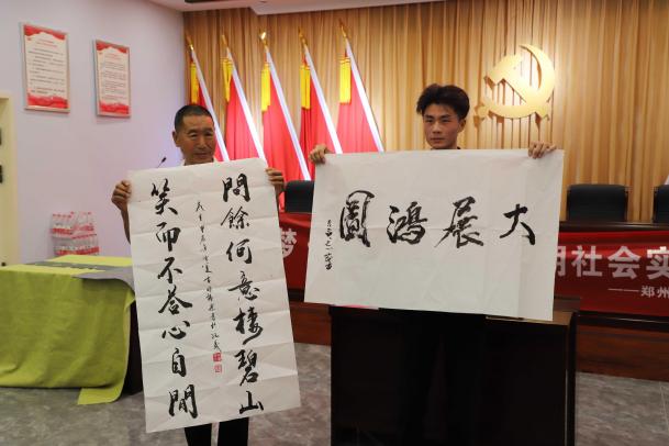 在书法展示环节,魏寨村老支书、老党员张钦茂与学生杨乐乐共同挥毫泼墨,完成了一幅幅精美的书法作品,并相互赠予。村民们纷纷驻足观看,对书法作品赞不绝口。