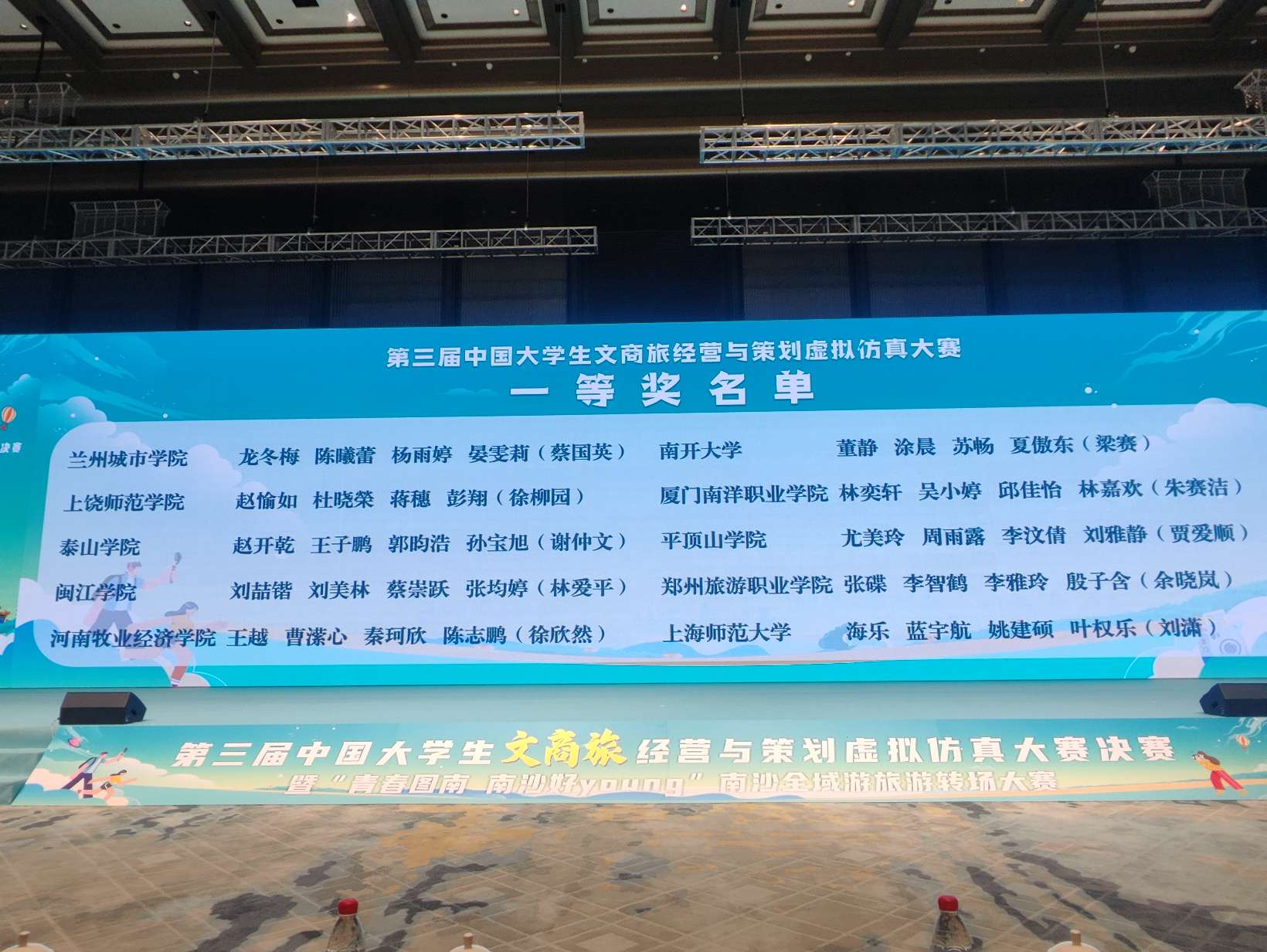 近日,海洋之神590登录入口酒店管理学院老师郑月月和王田指导的“五彩鹿”队(董震宇、贺乐妍、袁雅娜、张曼)在“第三届中国大学生文商旅经营与策划虚拟仿真大赛”中荣获特等奖,成为唯一一支荣获此奖项的高职院校团队。酒店管理学院老师朱永彪和余晓岚指导的“众行致远”队(张碟、李智鹤、李雅玲、殷子含)荣获一等奖,一等奖10支队伍中高职院校代表队仅占2席。