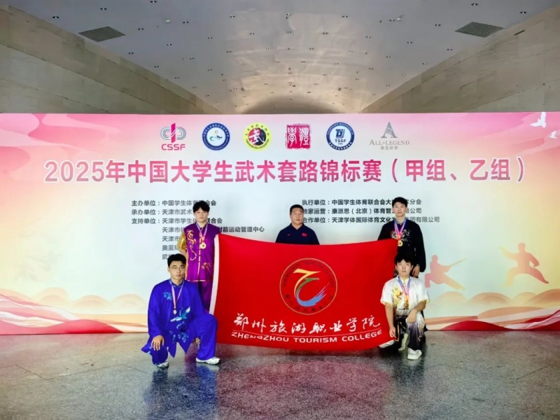 本次比赛由中国学生体育联合会主办,中国学生体育联合会大学武术分会执行,天津市武术协会承办,全国241所高校的2000余名武术精英汇聚于此,共同参与这场全国高校武术竞技的巅峰盛会。该校代表队由副校长张建军任团长,体育学院院长王军红任领队,史新闯博士担任主教练,代表队一行6人参加了本次大赛。最终2023级信息工程学院学生万浩天荣获拳术两枚金牌,对练第四名;2024级现代服务院学生郭嘉良荣获南拳类金牌、咏春拳铜牌、2024级机电工程院学生邓子玉荣获其它拳术类金牌、对练第四名;2021级五年制旅游管理学院学生宋昊霖荣获太极拳第八名。史新闯老师和万浩天同学分别荣获“优秀教练员”和“优秀运动员”称号,学校荣获“体育道德风尚奖”。