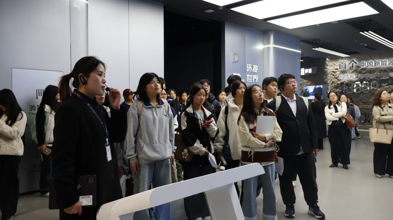 师生们在专业讲解员的引导下步入展厅,开启了约60分钟的“感知创新实践”之旅。刀片电池、兆瓦闪充技术、云辇等一项项核心技术的突破,使得新能源汽车实现“从跟跑到并跑再到领跑”的跨越式发展。同学们亲眼目睹、亲耳聆听了中国新能源企业自立自强的奋斗历程,生动的展品与详实的讲解,将书本上的“创新驱动发展战略”化为触手可及的鲜活案例,令大家深感震撼。