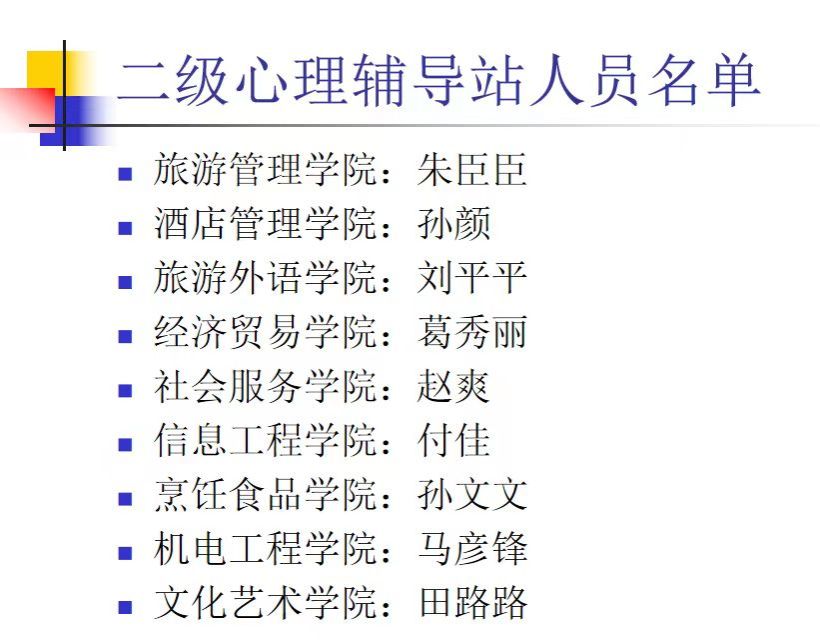 有意向参加此次培训的老师,可提交报名信息(姓名+学院)至二级学院心理负责老师处(二级学院心理负责老师名单如下),报名时间截止至11月27日上午10:00。