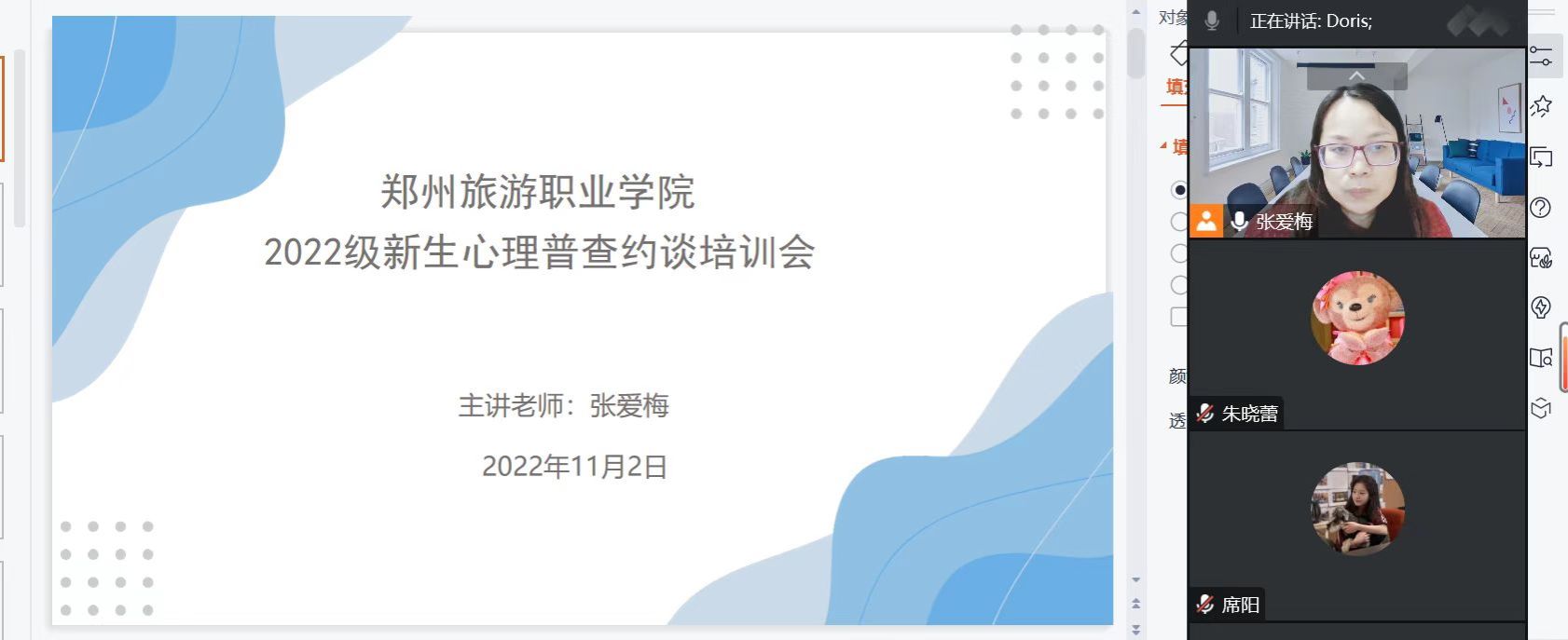 11月3日下午,学校 2022年心理普查深度访谈培训会在线上召开。学校心理健康中心全体人员、二级学院心理辅导站负责老师、 2022级专兼职新生辅导员参加本次会议。皮晓媛老师主持本次培训会。