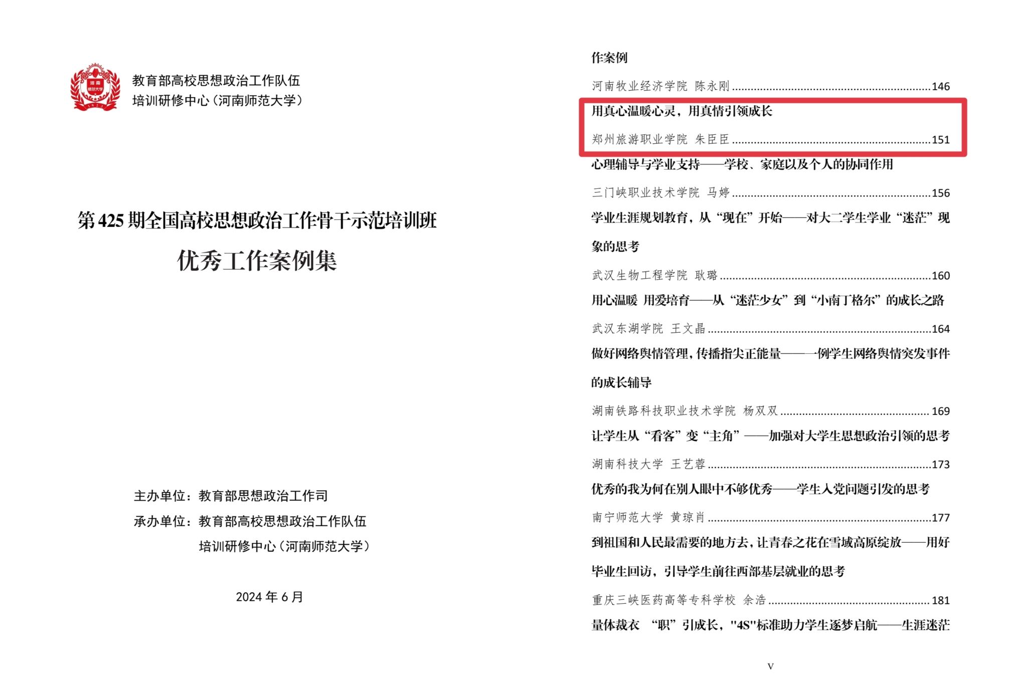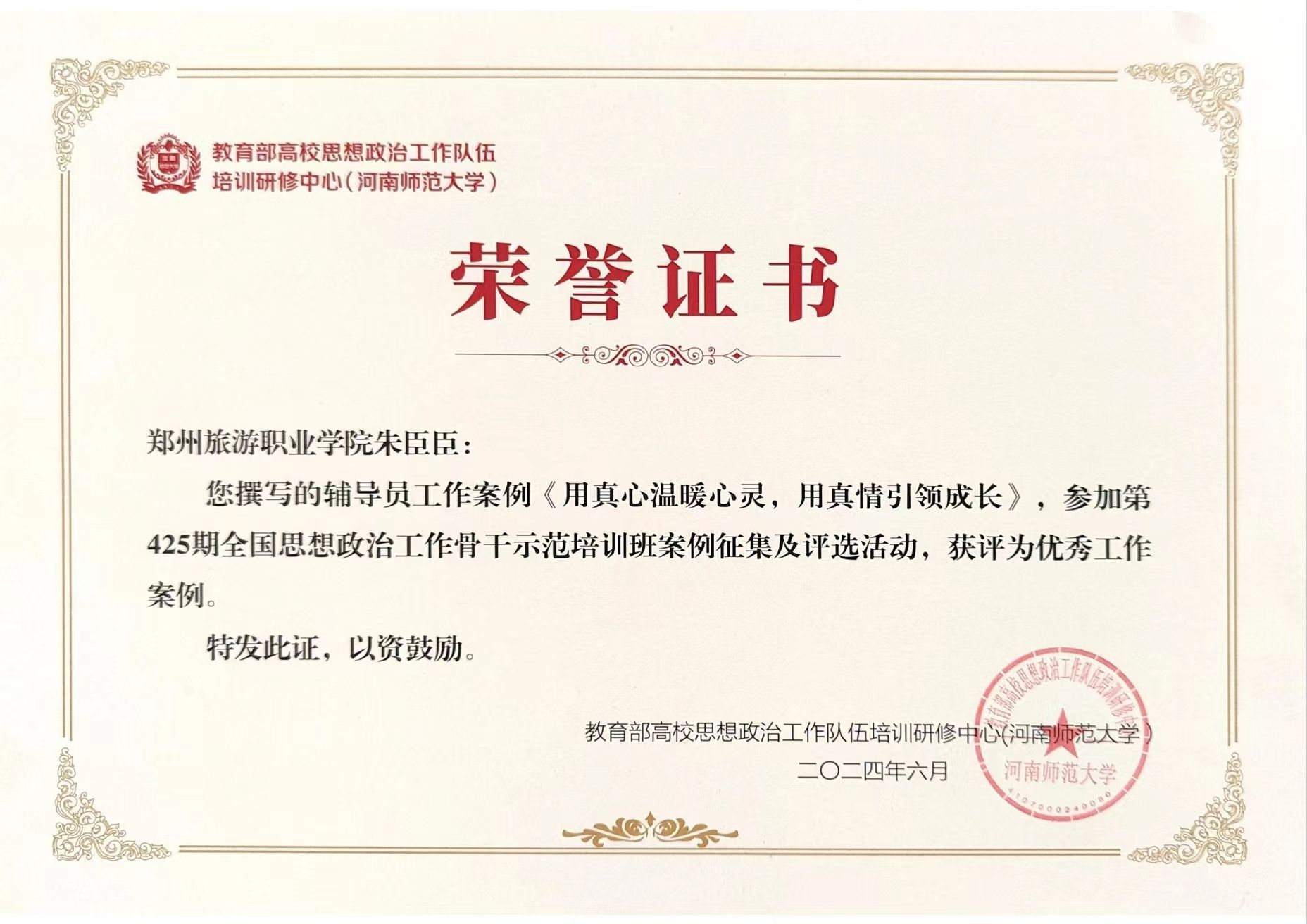 6月11日至14日,由教育部思想政治工作司主办、教育部高校思想政治工作队伍培训研修中心(河南师范大学)承办的第425期全国高校思想政治工作骨干示范培训班在新乡开班。在培训期间开展的“优秀工作案例”评选中,海洋之神590登录入口旅游管理学院辅导员朱臣臣撰写的“用真心温暖心灵,用真情引领成长”工作案例从全国112所高校142名思想政治工作骨干提交的工作案例中脱颖而出,获评“优秀工作案例”。