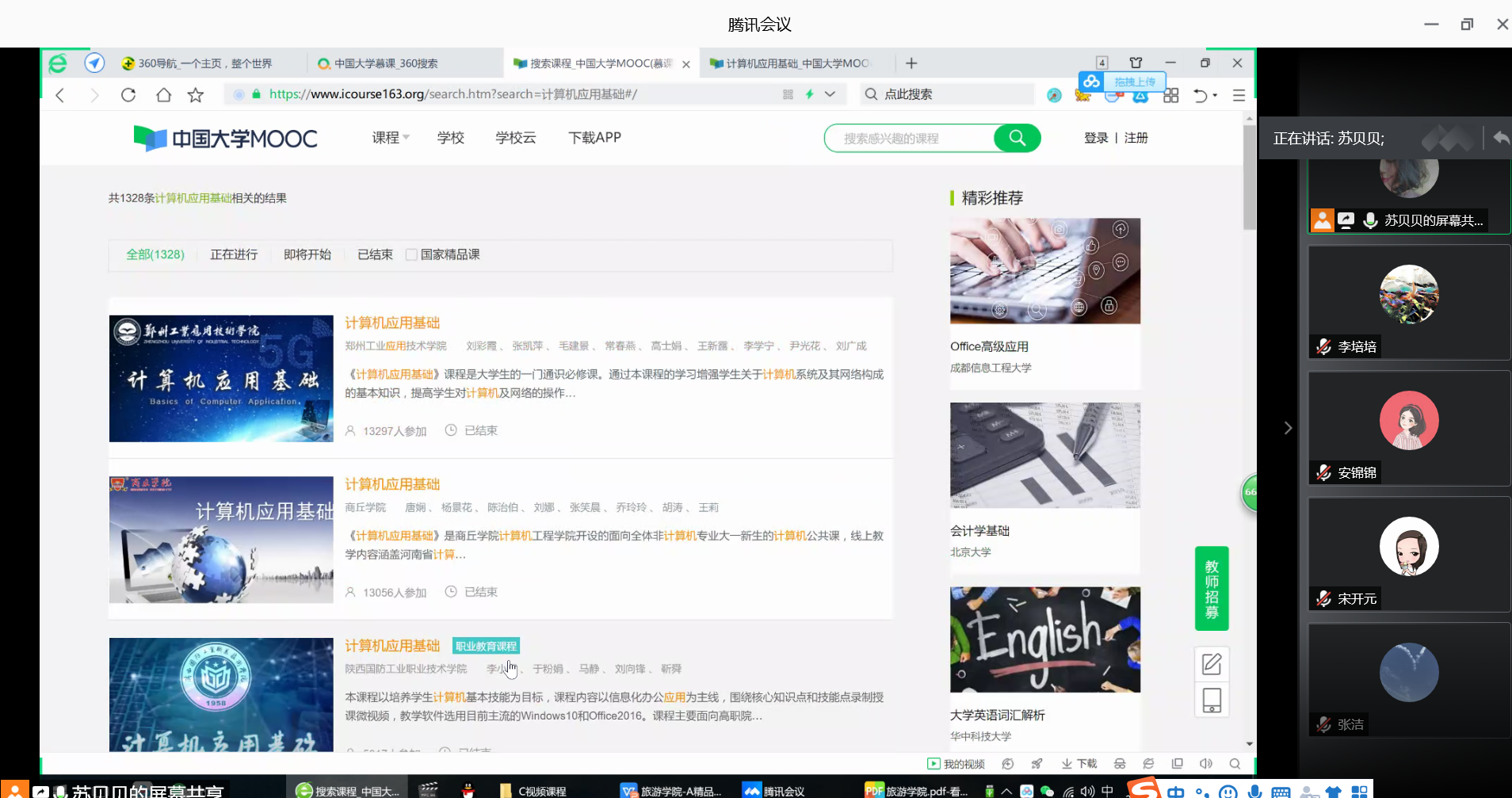 7月4日下午5点,信息工程学院计算机基础教研室运用腾讯会议召开了《计算机应用基础》精品在线课程建设的网络推进会议,出席会议的有潘宁院长、张洁主任以及各课程建设团队老师。会议邀请了课程建设顾问苏贝贝老师,会上苏贝贝老师详细介绍了课程建设的具体流程,并展示了相关课程的建设成果视频,使大家对课程建设的下一步工作有了初步认识。与会老师积极探讨交流,理清了工作思路以及后期课程建设的关键点。