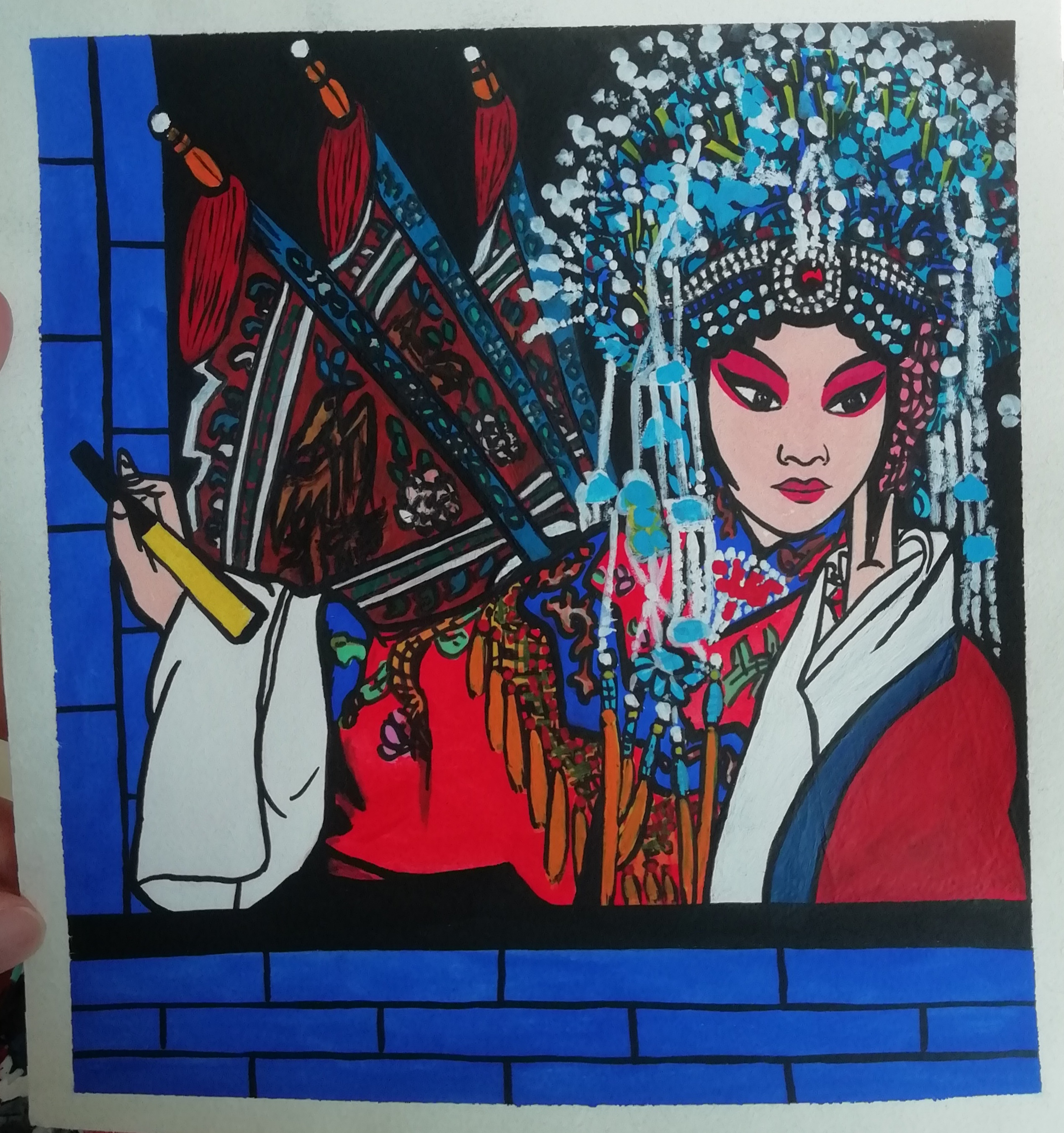 设计说明:《梨园春秋—旦角造型篇》的设计灵感来源于自己从小喜爱听戏,而且只喜欢特别感兴趣的片段、特别感兴趣的人物,幻想自己就是那戏曲中英姿飒爽的女将军。其实戏曲和生活是相关的,正所谓人生如戏,让我很好的从生活中取了很多素材,并进行稍微夸张的艺术加工,例如我作品中的人物和人物动作。因为不知道毕业后还会不会接触绘画,所以我希望将不同的类别的女角色集结在我的作品,从而绘制出优秀的作品。最终,梦想变为现实。我也希望通过我的作品以戏曲冰山一角让更多人了解戏曲艺术造型的魅力。艺术源于生活、而又高于生活、最后又回归生活,少许的写实结合稍微夸张的装饰画设计而最终完成的装饰画作品,装裱后适合于装饰各种场景,让人在生活点滴中感受戏曲的魅力。