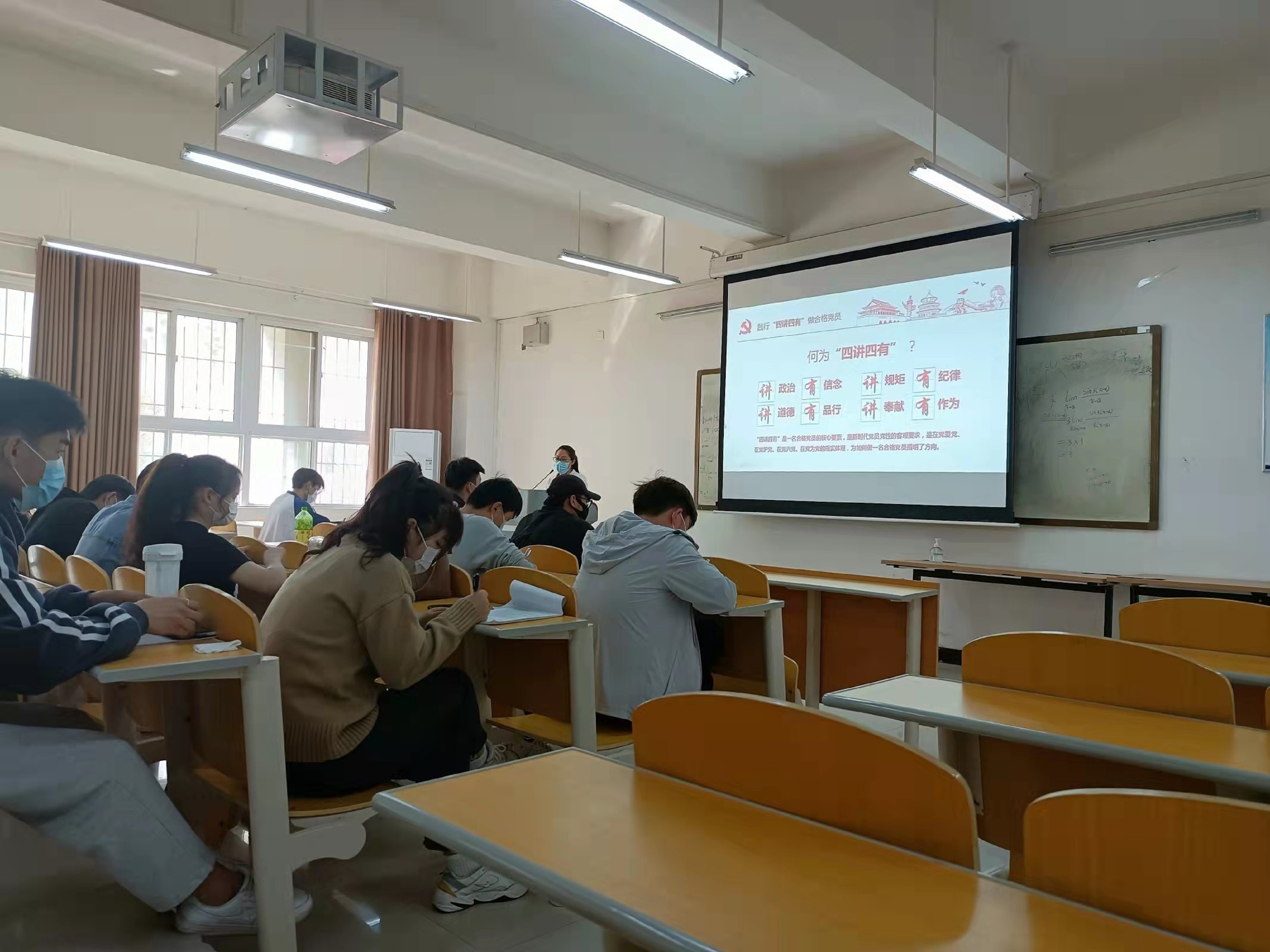 为了提升入党积极分子的政治素养,加强对党的认识了解,端正入党动机,2022年4月6日,信息工程学院在4B111进行了主题为《践行四讲四有做合格党员》的党课。本次党课由辅导员邢丹梅主讲,2021年度入党积极分子参加。