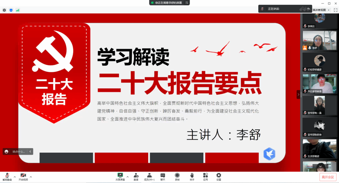 首先,李舒概括了党的二十大报告要点“高举中国特色社会主义伟大旗帜,全面贯彻新时代中国特色社会主义思想,弘扬伟大建党精神,自信自强,守正创新,踔厉奋发、勇毅前行,为全面建设社会主义现代国家、全面推进中华民族伟大复兴而团结奋斗!”使学生清晰了解了二十大报告的要点。