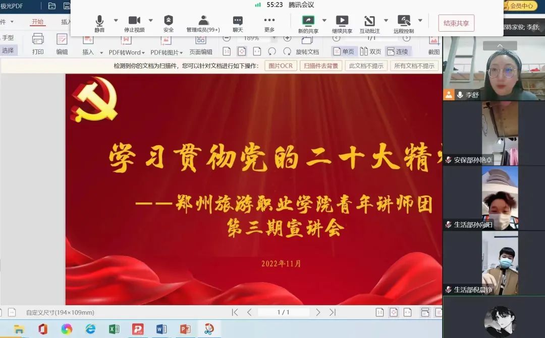 为深入学习贯彻习近平总书记在庆祝中国共产主义青年团成立100周年大会上的重要讲话精神,大力营造爱党爱国爱社会主义的浓厚氛围,持续深化“青年大学习”行动,推进马克思主义中国化、时代化、青年化,以习近平新时代中国特色社会主义思想为指导,围绕迎接和学习宣传党的二十大,推动党的青年理论武装工作创新发展,做好党的创新理论宣讲工作,按照学校党委要求,信息工程学院团总支书记李舒,作为青年讲师团的一员,于11月17日下午5点30召开党的二十大精神学习宣讲会,信工全体学团干部参加。