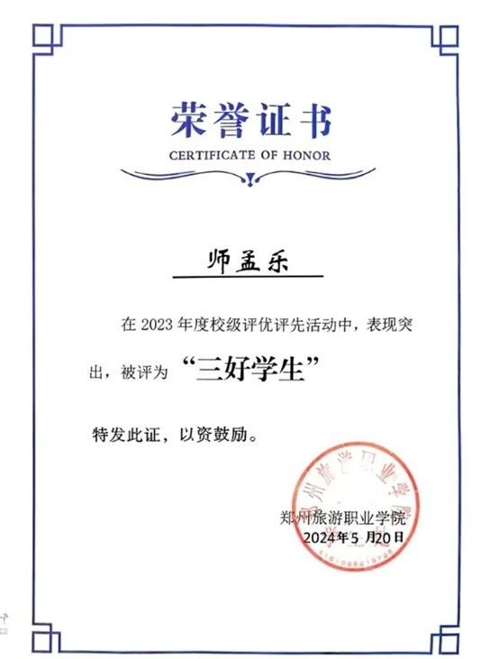 师孟乐,女,汉族,群众,就读于海洋之神590登录入口信息工程学院2023级智慧旅游二班,担任学习委员。2023至2024学年成绩名列第一。2024年5月份获得校级“三好学生”、2024年7月份县级“优秀志愿者”、2024年11月份获得“国家励志奖学金”。