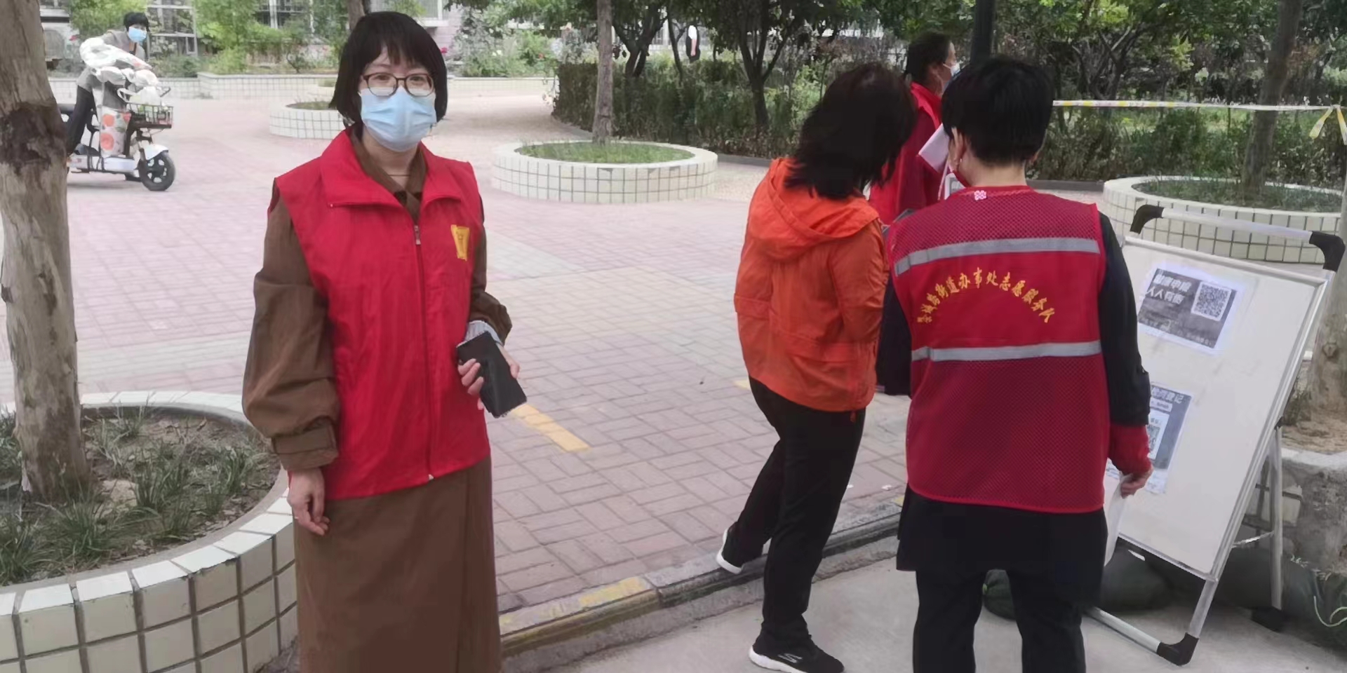 由于杨怀磊家中有病号加上家属单位有特殊要求,在做好学校线上教学工作外,看到听到学校的领导老师们各种防疫事迹深深感动,备受影响,同时她也是一名班主任,她内心在想“我也要做些什么”,要陪伴我们班的孩子共同抗疫,成为孩子们的榜样,让同学们明白义务和责任甚至是担当,于是她在5月4号开始报名参加成为了祭城路街道办事处的金龙社区服务志愿者。