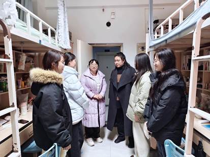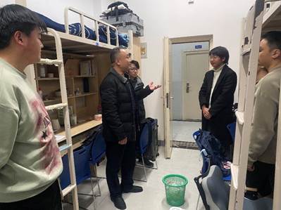 走访期间,潘宁、周鹏和李舒走进学生宿舍,与同学们亲切交谈。针对不同年级学生,领导们给予了具体指导:鼓励大一新生好好复习迎接第一次期末考试;叮嘱高年级学生面临实习就业时保持良好心态。同时,领导们反复强调冬季宿舍用电安全,要求大家杜绝违规电器,共建平安和谐的居住环境。
