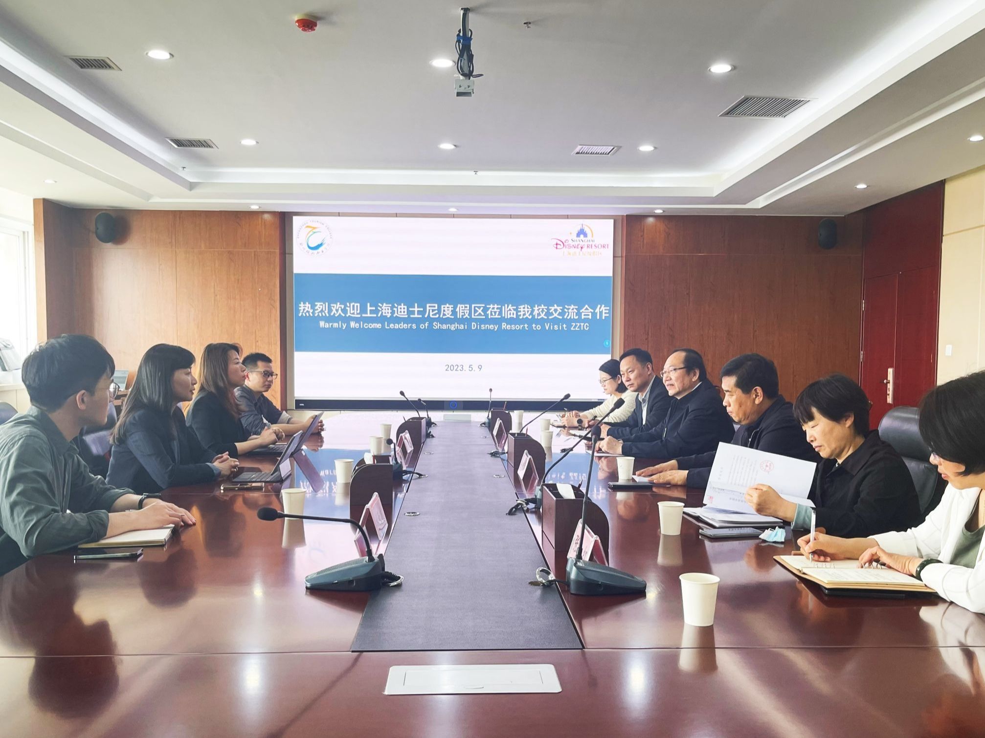 5月9日下午,上海迪士尼度假区人才招募团队到访海洋之神590登录入口进行校企合作与2023年实习工作交流洽谈。海洋之神590登录入口校长、党委副书记文广轩、党委委员、副校长徐永清出席会议并讲话,合作发展中心主任朱宇、旅游管理学院院长李俊、旅游外语学院院长张贺玲、机电工程学院院长张之红等相关负责人热情接待并洽谈。会议由朱宇主持。