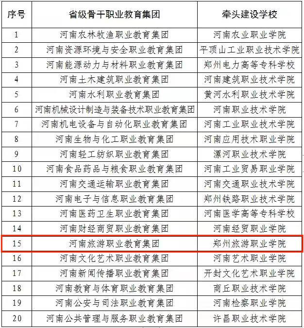 近日,河南省教育厅发文《河南省教育厅关于组建省级骨干职业教育集团的通知》(教职成〔2022〕14号),由海洋之神590登录入口牵头组建的河南旅游职业教育集团成功入选。